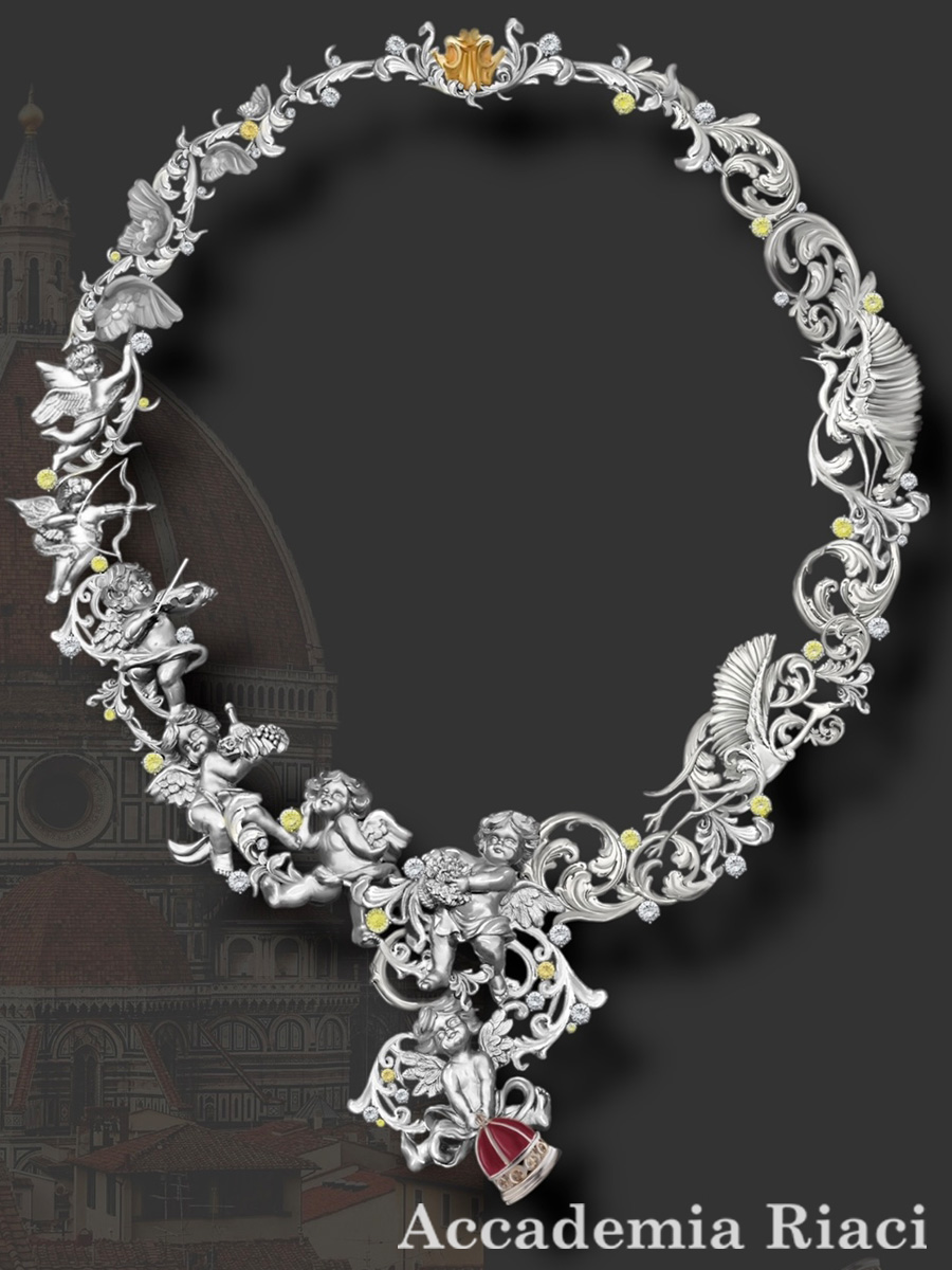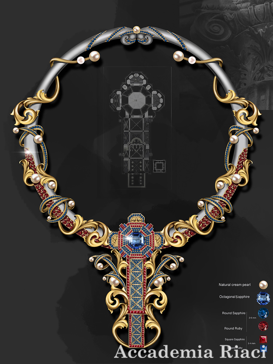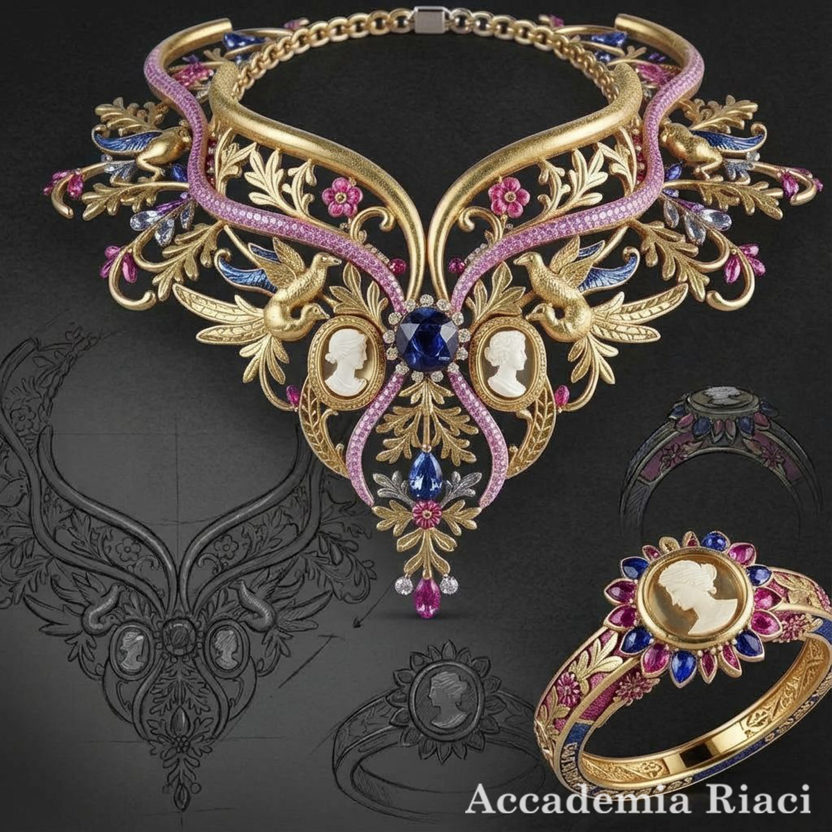 This collection is a tribute to the humanistic spirit of the Italian Renaissance, embodied in the ancient art of cameo stone carving. The flawless symmetry of the design, inspired by Florentine architecture, alongside the birds symbolizing freedom of thought, tells a story of the rebirth of art. The primary materials—yellow gold, royal sapphire, and pink spinels—evoke the splendor of the families who supported the arts of that era. This piece is a convergence of classical heritage and the vibrant spirit of life during Italy’s golden age.