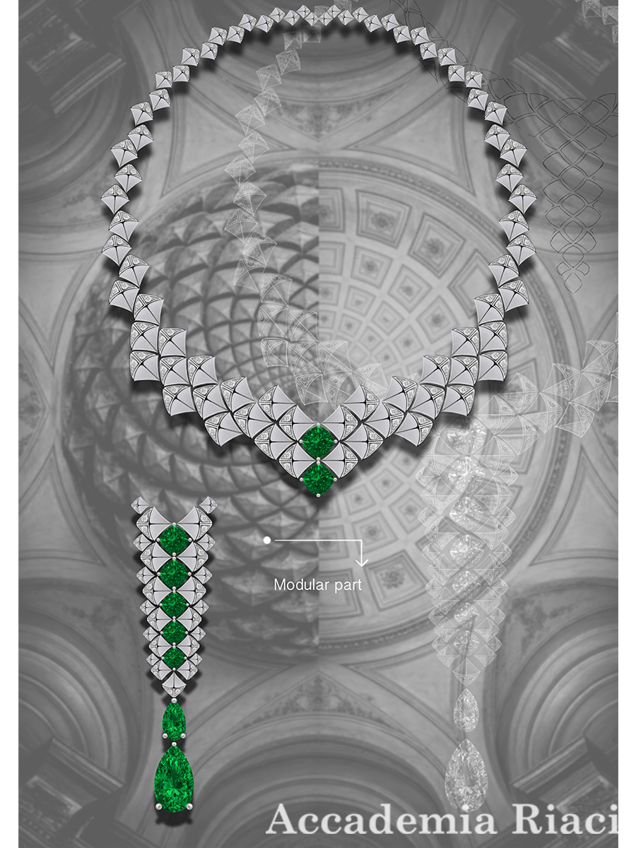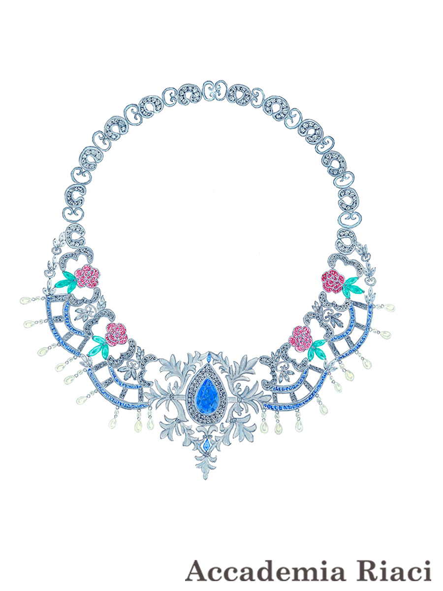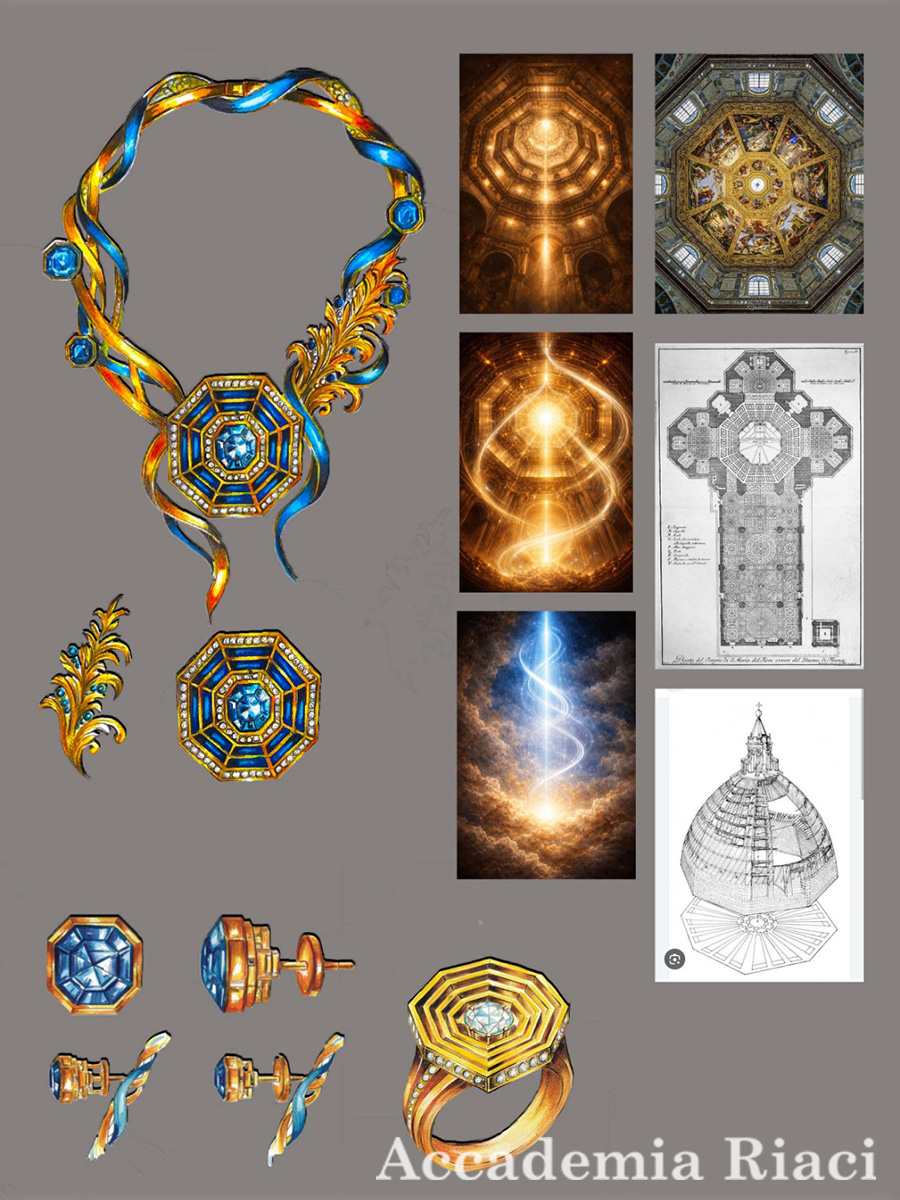This collection is a tribute to the humanistic spirit of the Italian Renaissance, embodied in the ancient art of cameo stone carving. The flawless symmetry of the design, inspired by Florentine architecture, alongside the birds symbolizing freedom of thought, tells a story of the rebirth of art. The primary materials—yellow gold, royal sapphire, and pink spinels—evoke the splendor of the families who supported the arts of that era. This piece is a convergence of classical heritage and the vibrant spirit of life during Italy’s golden age.