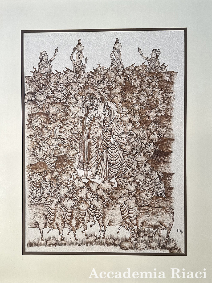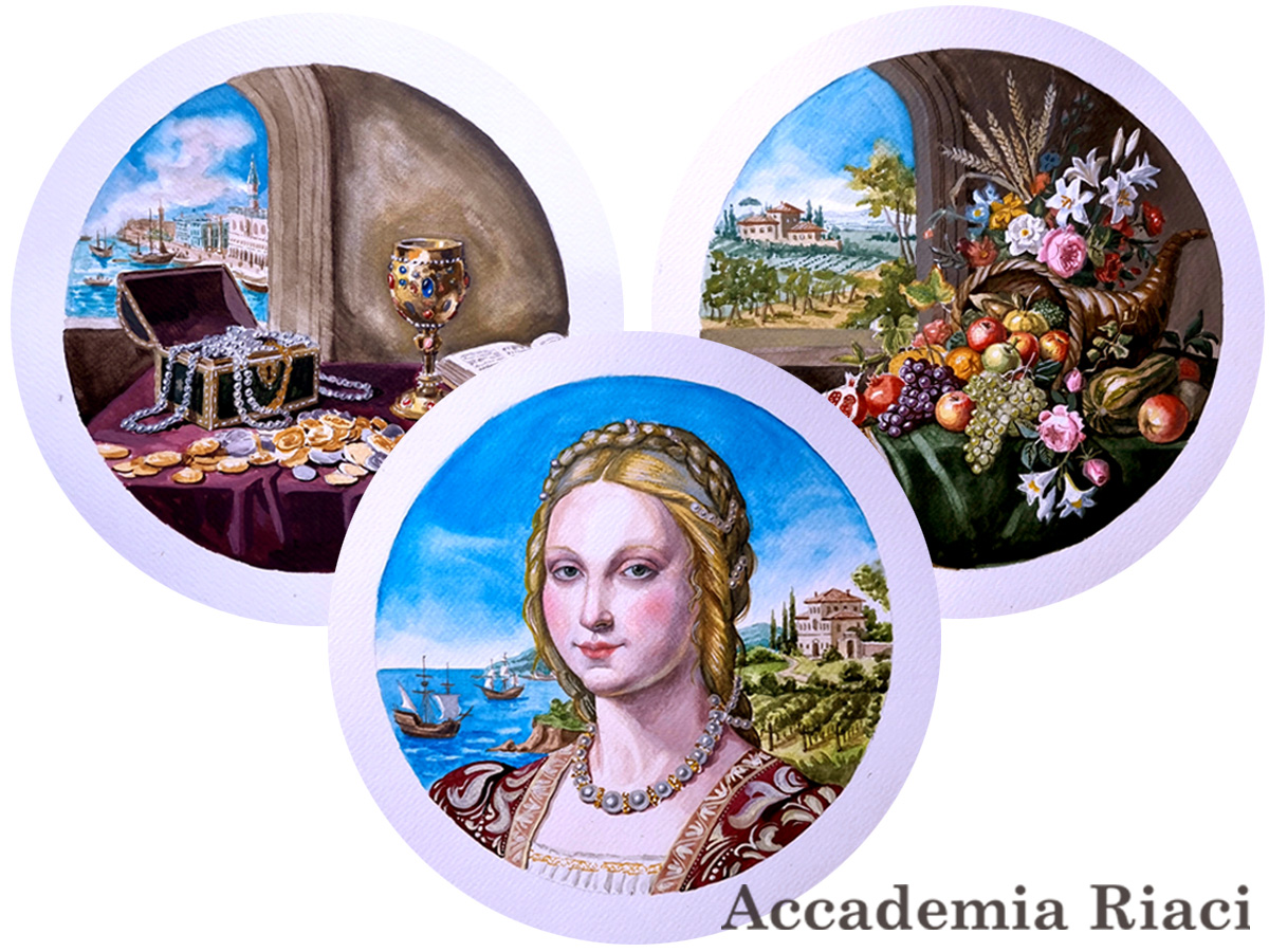 A female figure stands at the center of the work: young and pure, she represents the promise of a bright future. The side panels complete the allegory: on the left, a still life evokes wealth and abundance, while on the right, cornucopia symbolizes health and fertility. The choice of the Renaissance style is not accidental: it is the ideal language to give shape to these allegories, uniting past and present in a single wish for happiness.