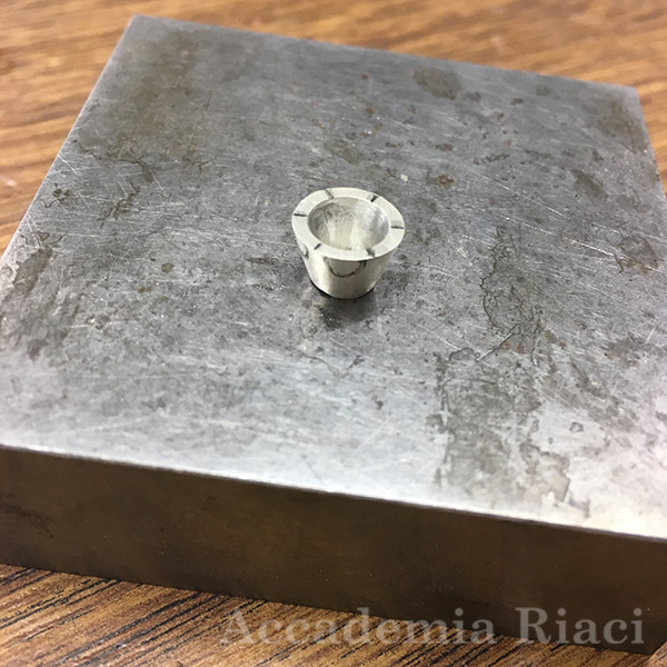 Pic7-10 石留め部分を作り終わったら、次は石留めの台座を作ります。石留めを作った時と同じように銀の板を切り出し、筒状に整形していきます。この時、石留めの下の部分が乗るように大きさを調整していきます。調整し終わったら溶接し、磨き上げて終わりです。