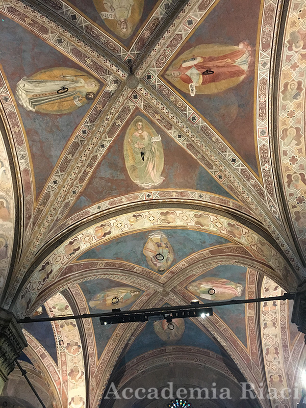 教会の天井にはたくさんのフレスコ画が施されていますが、それぞれの人物の真ん中に輪っかが垂れ下がっています。これはオルサンミケーレ教会になる前の市場だった頃の名残で、明かりを下げるためにあるものだったそうです。