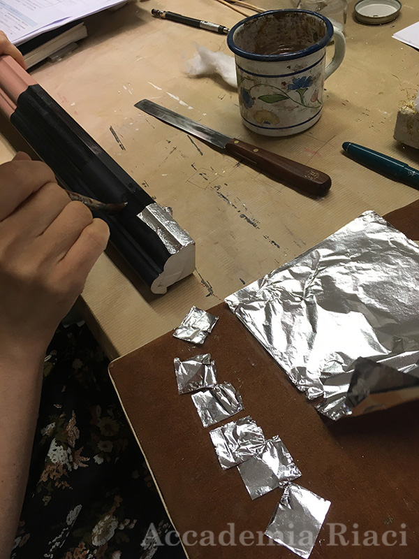 Doratura a Gazzoの古典の箔貼り方も、箔置きの作業に入りました。Boloの上に膠水を置いて、すぐに箔を置きます。今回は本銀、偽銀に、Boloを磨いたところ、そのままのところと仕上がり具合の違いがわかるように見本を作っています。今後のため、技法、素材の違いが一瞥比較できるようにするためです。何の箔を使うかによって、膠の濃度も異なるので、色々と細かく学べてとても充実しています。