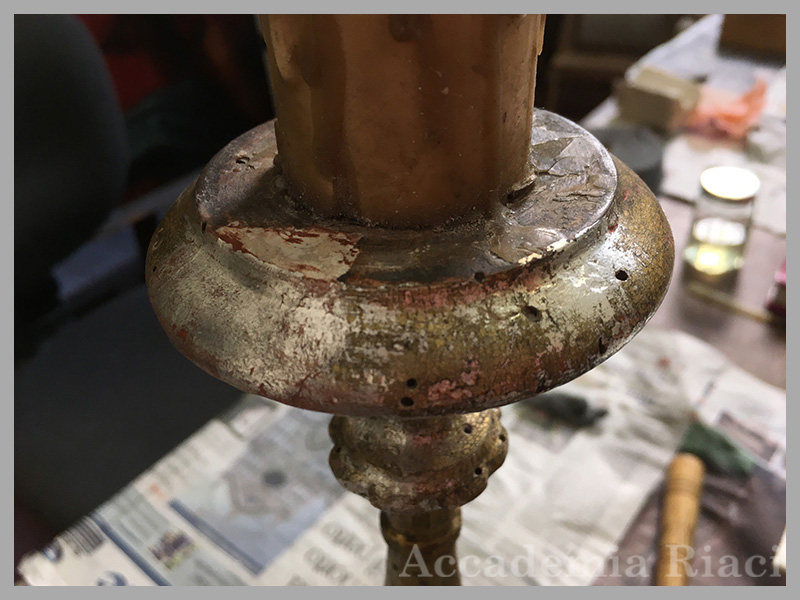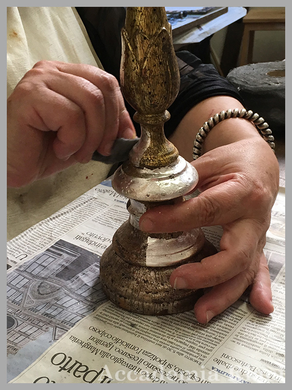 この修復の他に、金や銀を使わずに絵の具で修復する方法も習う。これは、近くから見たら修復した部分が分かるが、遠くから見たらあまりわからないように見える、修復方法。絵画修復でよく使われる。”Tratteggio”と呼ばれる。金の場合、基本が①黄色、②Boloに近い赤、③LaccaVerde透明系の緑。しかしオリジナルに近ずけることが一番大事なので、前後しても良い。